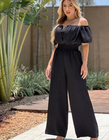 Com decote ombro a ombro, este modelo é perfeito para valorizar o colo e criar um look fresco e feminino. A cintura com elástico oferece conforto, sem perder a elegância das pernas amplas.