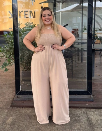 Confortável do início ao fim. O lastex no busto oferece ajuste firme e macio, enquanto a perna ampla cria um efeito wide muito bonito.