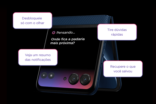 Além disso, recursos da Moto ajudam na produtividade, gestos rápidos e personalização. Para quem busca celular dobrável com Android limpo, esse é um ponto bastante positivo.